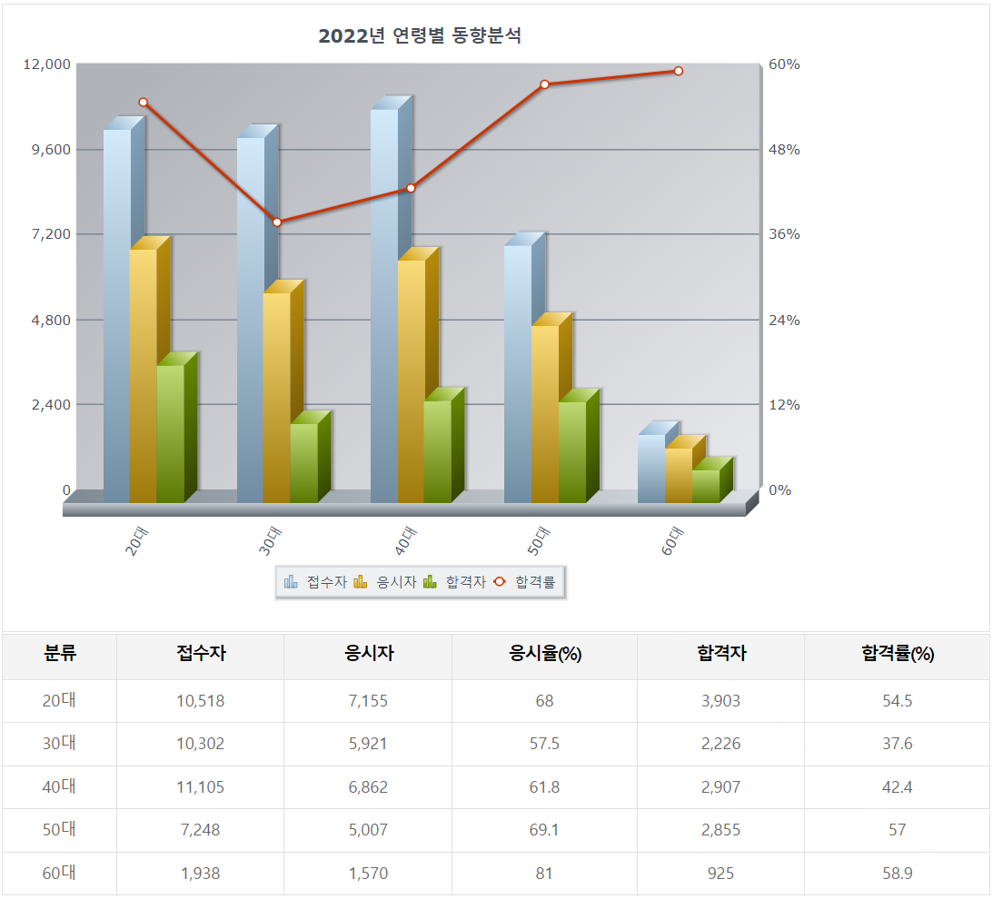 가장 낮은 37.6%의 합격률을 보인 연령대는 30대로 5,921명이 응시하여 2,226명이 합격했습니다. 나머지 연령대의 합격률도 위 표를 보고 참고하길 바라겠습니다.