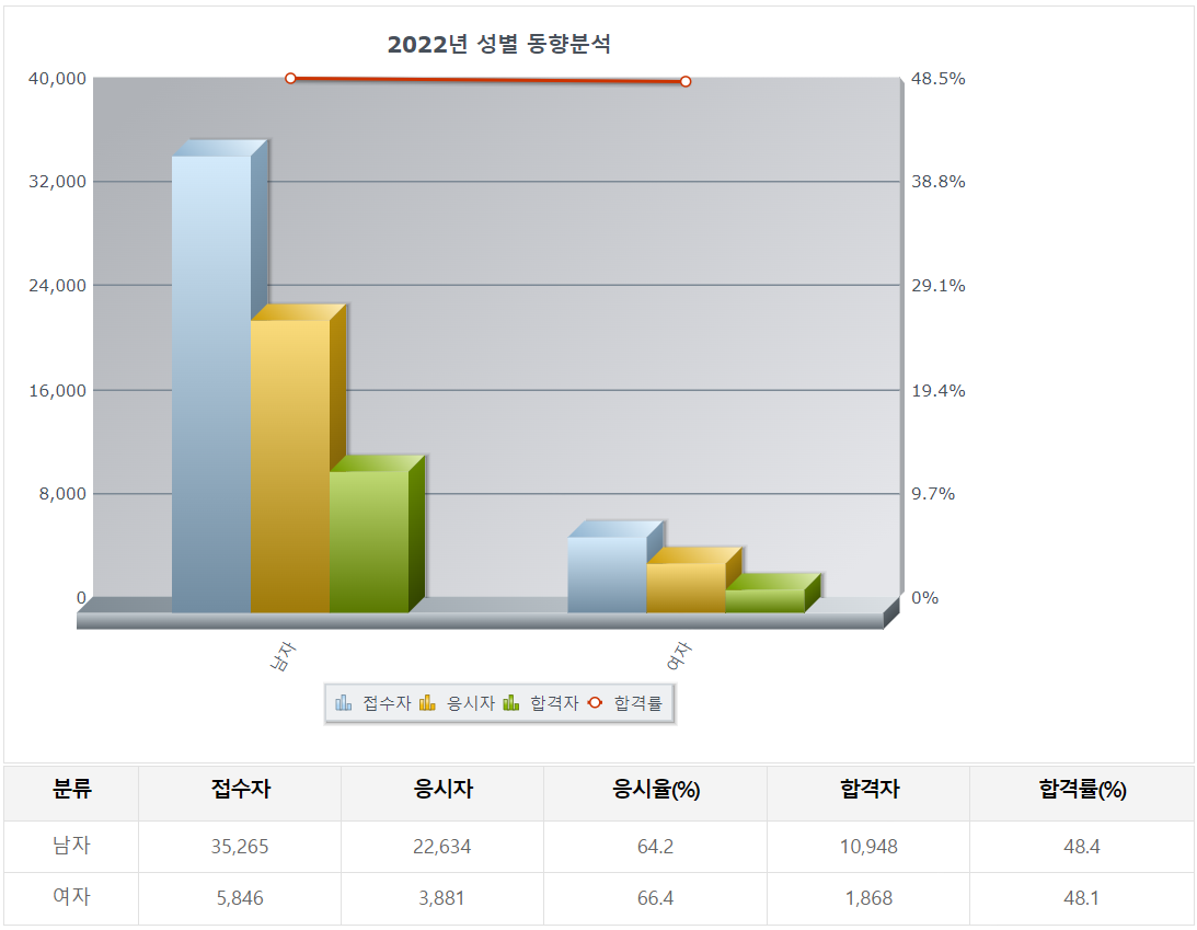 1. 성별을 기준으로 합격률을 살펴보면 남자의 응시인원이 22,634명, 합격자가 10,948명으로 48.4%의 합격률을, 여자는 3,881명이 응시하고 1,868명이 합격하여 48.1%가 합격했습니다. 응시인원은 남자가 많으나 합격률이 비슷했습니다.