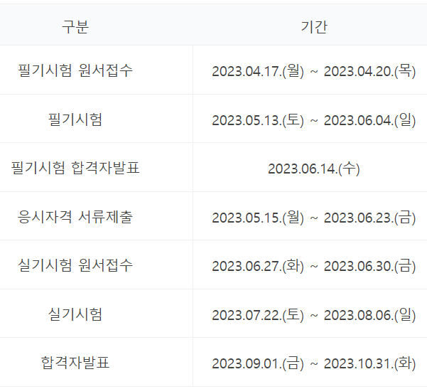 실기시험은 7월 22일부터 8월 6일까지, 최종 합격자 발표기간은 9월 1일부터 10월 31일까지입니다.