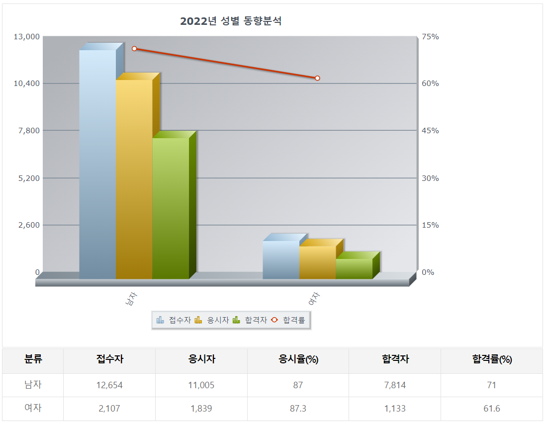 1. 성별을 기준으로 합격률을 살펴보면 남자의 응시인원이 11,005명, 합격자가 7,814명으로 71%의 합격률을, 여자는 1,839명이 응시하고 1,133명이 합격하여 61.6%가 합격했습니다. 남성의 합격률이 10% 정도 높았습니다.
