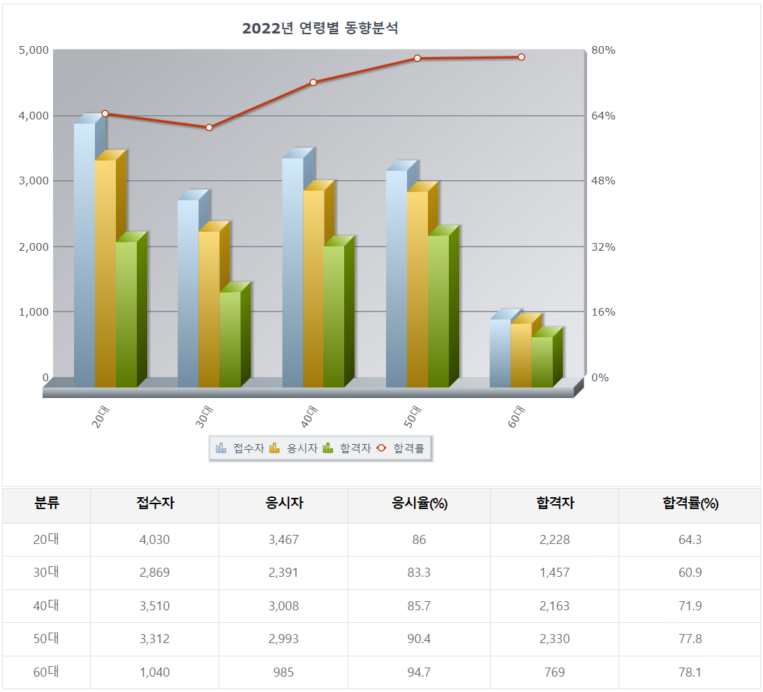 가장 낮은 60.9%의 합격률을 보인 연령대는 30대로 2,391명이 응시하여 1,457명이 합격했습니다. 나머지 연령대의 합격률도 위 표를 보고 참고하길 바라겠습니다.