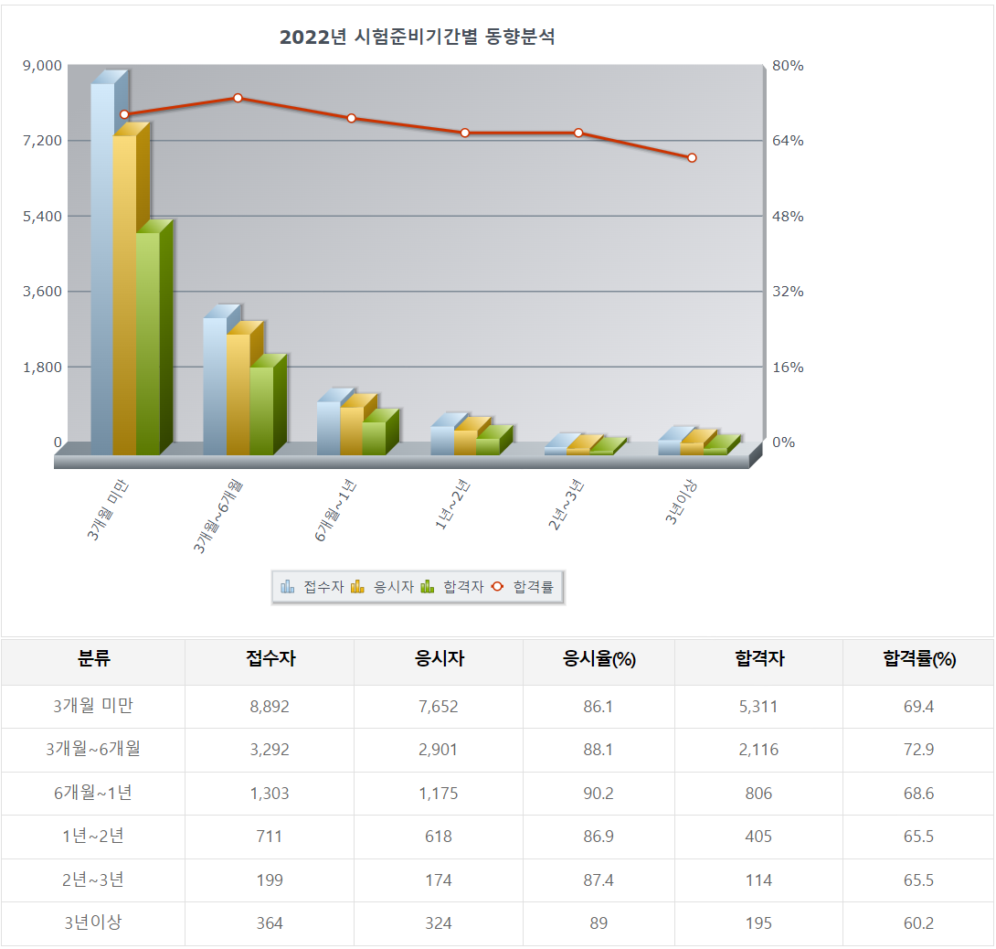가장 낮은 시험준비기간 합격률은 3년 이상으로 324명이 응시하고 195명이 합격하여 60.2%의 합격률일 보였습니다.