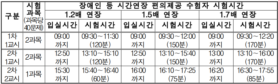 아래는 장애인 등 시간 연장 편의제공 수험자의 시험 시간입니다. 시험시간 연장이 필요하신 분들이라면 아래 표를 참고하시면 됩니다.