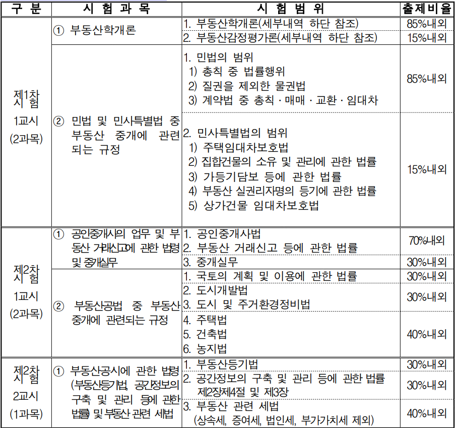 공인중개사 시험과목 및 출제비율