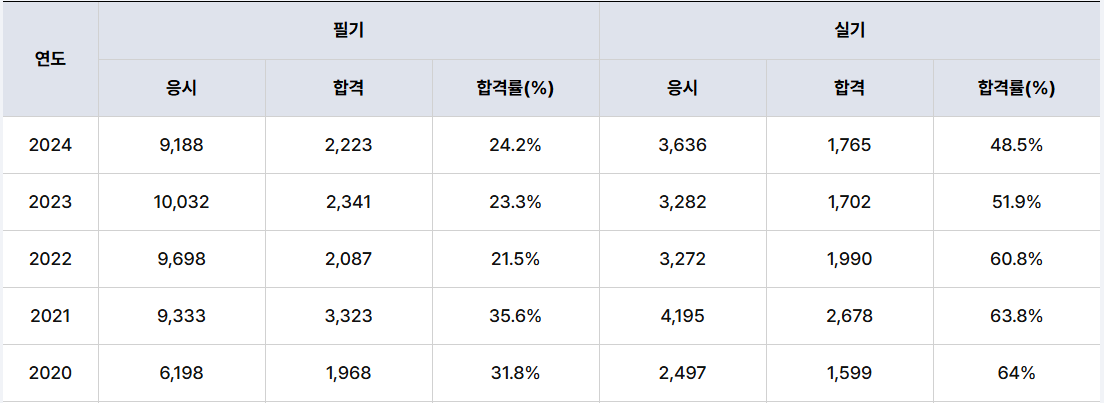 매년 9천 명 이상이 시험에 응시하는데, 필기합격률은 20%대인 것을 보면 필기가 꽤 어려운 시험인 것 같습니다.
