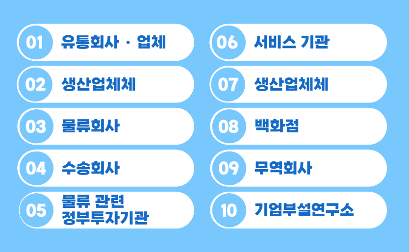간단히 알아보자면, 유통회사 · 업체, 생산업체, 물류회사, 수송회사, 물류 관련 정부투자기관, 서비스 기관, 컨설팅 기관, 대기업 물류회사, 백화점, 무역회사, 기업부설연구소 등이 있습니다.