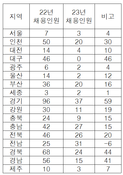 더욱 놀라운 곳은 대구입니다. 대구는 22년에 46명을 채용했었습니다. 하지만 앞서 언급한 바와 같이 23년에는 0명으로 채용하지 않았습니다.