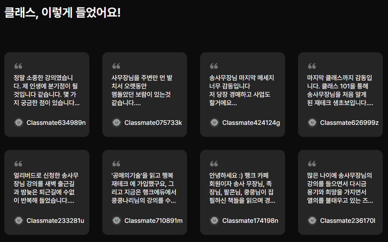 그리고 (주)케이알리츠, 도서출판 지혜로, 행크에듀 대표입니다. 참고로 클래스101에서 강의를 수강하고 행크에듀에서 단계별 강의를 수강해보려고 했는데 지금 저의 상황에서 수강료를 내기엔 조금 부담이 있는 금액이라 수강하지는 못했었어요. 하지만 클래스101에서의 강의도 많은 정보를 알려주시고, 다른 강의들도 아직 많이 있기에 송사무장님의 단계별 강의는 좀 더 후에 수강하려고 해요.