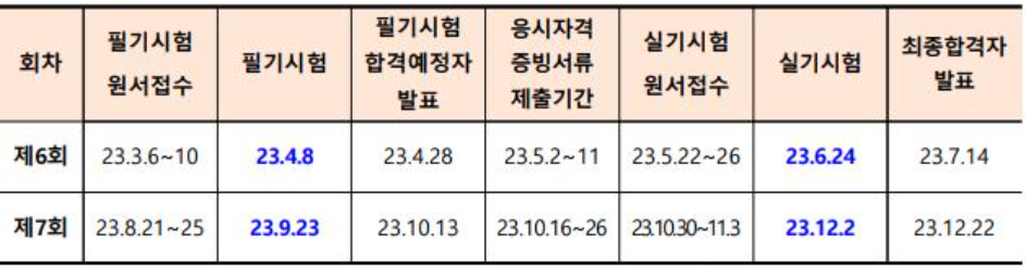 마지막으로 23년 시험일정을 알아보겠습니다. 올해 시험은 2회 시행되었습니다. 제6회 시험은 원서접수가 3월 6일부터 10일까지였고, 시험일이 4월 8일이었습니다. 실기 원서접수는 5월 22일부터 26일까지, 시험일은 6월 24일 그리고 최종합격은 7월 14일이었습니다.
