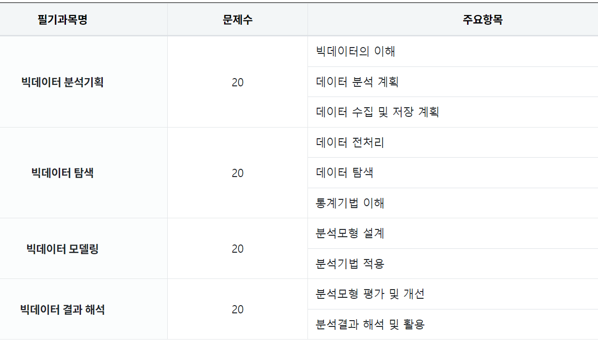 (주요항목 : 빅데이터의 이해, 데이터분석 계획, 데이터 수집 및 저장 계획)