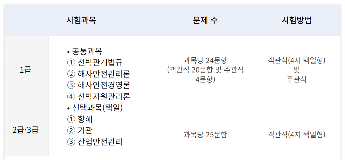 그리고 선박안전관리사 시험은 1급, 2급, 3급 모두 필기시험을 치르게 되지만 1급과 2급의 경우는 필기시험에 합격한 뒤 면접시험에 합격해야 합니다. 시험과목은 아래에서 확인해 보겠습니다.