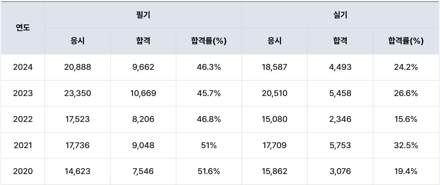 필기는 20,888명으로 2만 명이 넘는 인원이 응시했는데, 실기까지의 합격률은 24.2%로 낮았습니다.