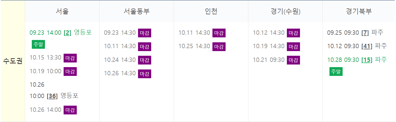 먼저 수도권으로 서울, 서울동부, 인천, 경기(수원), 경기북부에서 시험이 시행되고 있으나 현재는 대부분이 마감된 것을 확인할 수 있습니다.