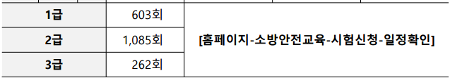 소방안전관리자 2급은 1급과 3급을 비교해서 보면 가장 많은 수의 시험이 시행되고 있습니다. 23년을 기준으로 시험운영 횟수를 살펴보면, 1급은 603회, 2급인 1,085회, 3급은 262회가 시행되었습니다.