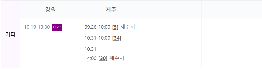 마지막 강원과 제주인데 강원도는 마감되었으며, 제주는 아직 가능한 날짜가 많습니다.