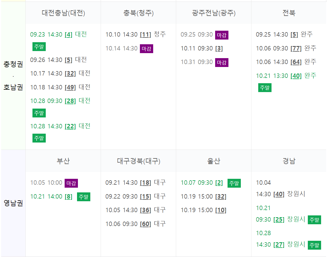 충청권과 호남권에서는 대전, 충남, 충북, 광주, 전남, 전북이 있습니다. 아직 마감된 곳이 많지 않습니다. 영남권에서는 부산, 대구, 경북, 울산, 경남이 있습니다.