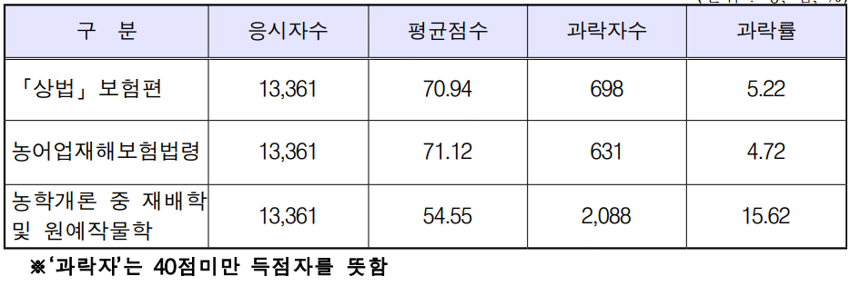 2차 시험의 과락률이 높습니다. 농작물재해보험 및 가축재해보험의 이론과 실무는 9,016명 중 4,462명이 과락해 49.49%의 과락률을 보였습니다. 절반의 사람들이 과락으로 떨어졌습니다.