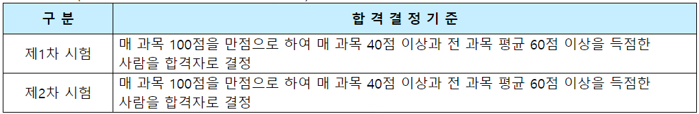 1차와 2차 시험의 합격기준은 매 과목 100점을 만점으로 하여 매 과목 40점 이상과 전 과목 평균 60점 이상을 득점한 사람을 합격자로 결정됩니다.