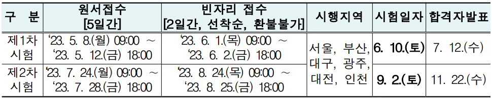 1차 시험의 원서접수기간과 빈자리접수기간은 5월, 시험일은 6월, 합격자 발표는 7월입니다.