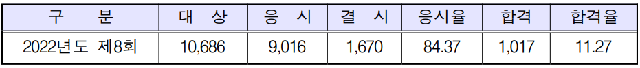하지만 2차 시험은 다릅니다. 22년 기준으로 보면 접수는 10,686명이 했지만, 9,016명만이 응시하여 84.3%의 응시율을 보였습니다. 하지만 합격은 1,017명으로 11.2%의 낮은 합격률을 보였습니다.