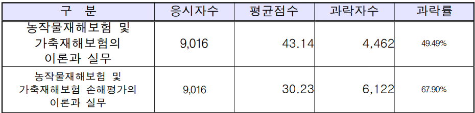 2차 시험의 과락률이 높습니다. 농작물재해보험 및 가축재해보험의 이론과 실무는 9,016명 중 4,462명이 과락해 49.49%의 과락률을 보였습니다. 절반의 사람들이 과락으로 떨어졌습니다.