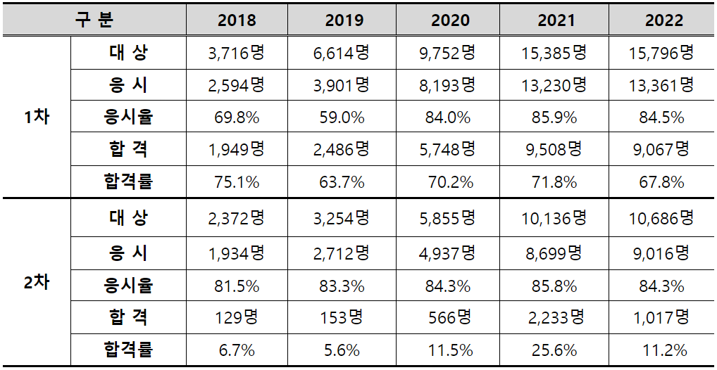 22년을 기준으로 보면, 1차 시험에서 15,796명이 접수하고, 13,361명이 응시했습니다. 따라서 84.5%의 응시율을 보였고, 9,067명이 합격하여 67.8%의 높은 합격률을 보였습니다. 5년간의 합격 통계 자료를 보면 1차 시험은 60~70%의 합격률을 보여 대다수의 응시자가 합격하는 것으로 확인됩니다.