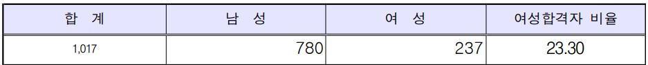 2차 시험의 성별현황도 1차 시험과 비슷한 비율을 보입니다. 남성이 780명, 여성이 237명으로 여성합격자 비율이 23.30%입니다.
