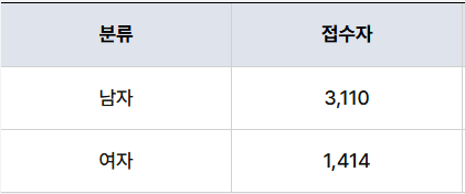 최근시험인 24년 시험의 접수인원을 확인해 보면, 남자는 3,110명이고, 여자는 1,414명이었습니다.
