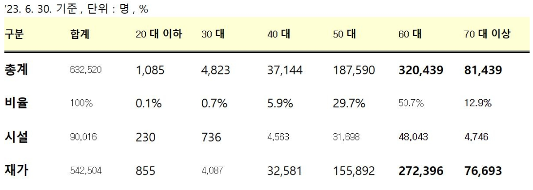 현재는 요양원 등에서 요양보호사로 근무하는 사람들의 60%는 60대 이상이 많고, 다음은 50대이며, 가장 적은 연령대는 30대 이하입니다. 또한 용양보호사의 부족한 인력은 외국인으로 채워지고 있다고 합니다.