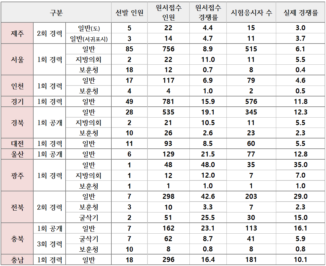 이제 많은 수험생들이 가장 궁금해 할 운전직공무원의 경쟁률입니다. 현재까지 발표된 경쟁률만 정리되었고, 아직 시험이 시행되지 않은 지역의 경쟁률은 제외되었으니 참고해 주세요.