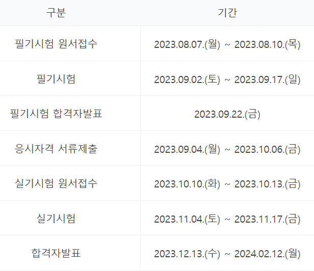 실기시험일의 경우는 11월 4일(토)부터 11월 17일(금)까지 진행되었고, 합격자 발표는 12월 13일(수)부터 24년 2월 12일(월)까지입니다.