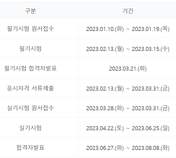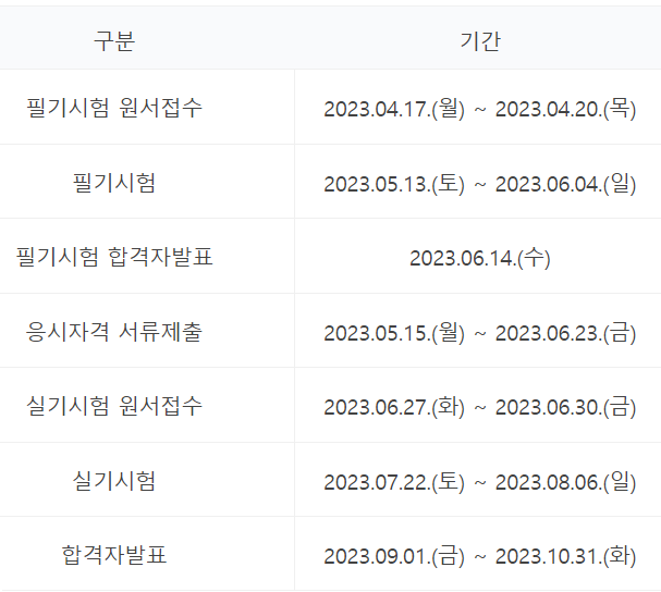실기시험일의 경우는 4월 22일(토)부터 6월 25일(일)까지 진행되었고, 합격자 발표는 6월 27일(화)부터 8월 8일(화)지였습니다.