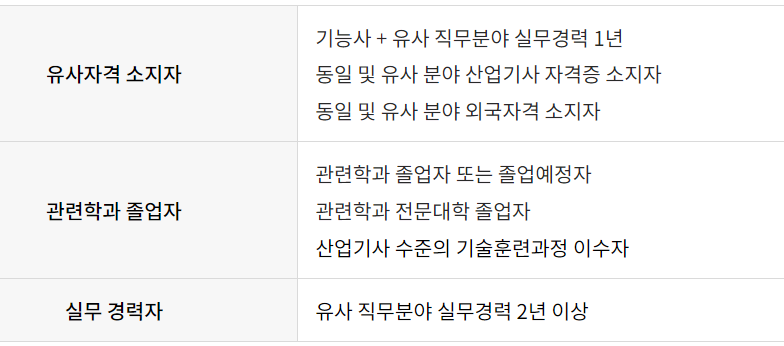 1. 기능사 등급 이상의 자격을 취득한 후 응시하려는 종목이 속하는 동일 및 유사 직무분야에 1년 이상 실무에 종사한 자