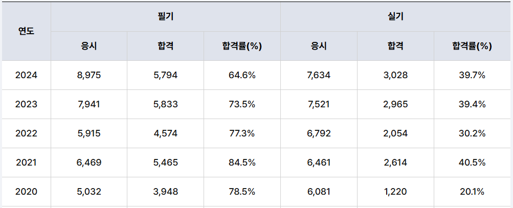 앞서 합격률을 살펴보았을 때, 필기보다는 실기 합격률이 더 낮았습니다.
