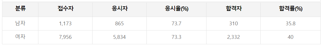 다음 총 필기 합격자 수는 5,806명이었고, 남자는 754명으로 합격률 68.9%를 보였고, 여자는 5,052명으로 합격률은 74.2%를 나타냈습니다.