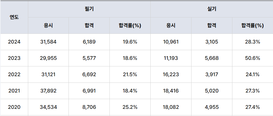 5년간의 필기합격 평균을 보면 20.66%였고, 실기합격 평균은 31.54%였습니다.
