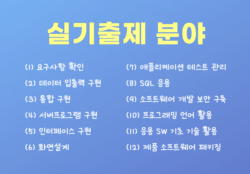 1. 소트프웨어 설계 2. 소프트웨어 개발 3. 데이터베이스 구축 4. 프로그래밍 언어 활용 5. 정보시스템 구축관리입니다.