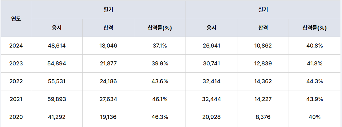 최근인 2024년에는 48,614명이라는 많은 인원이 필기시험에 응시했고, 18,046명의 합격자가 나와 37.1%의 합격률을 보였습니다.