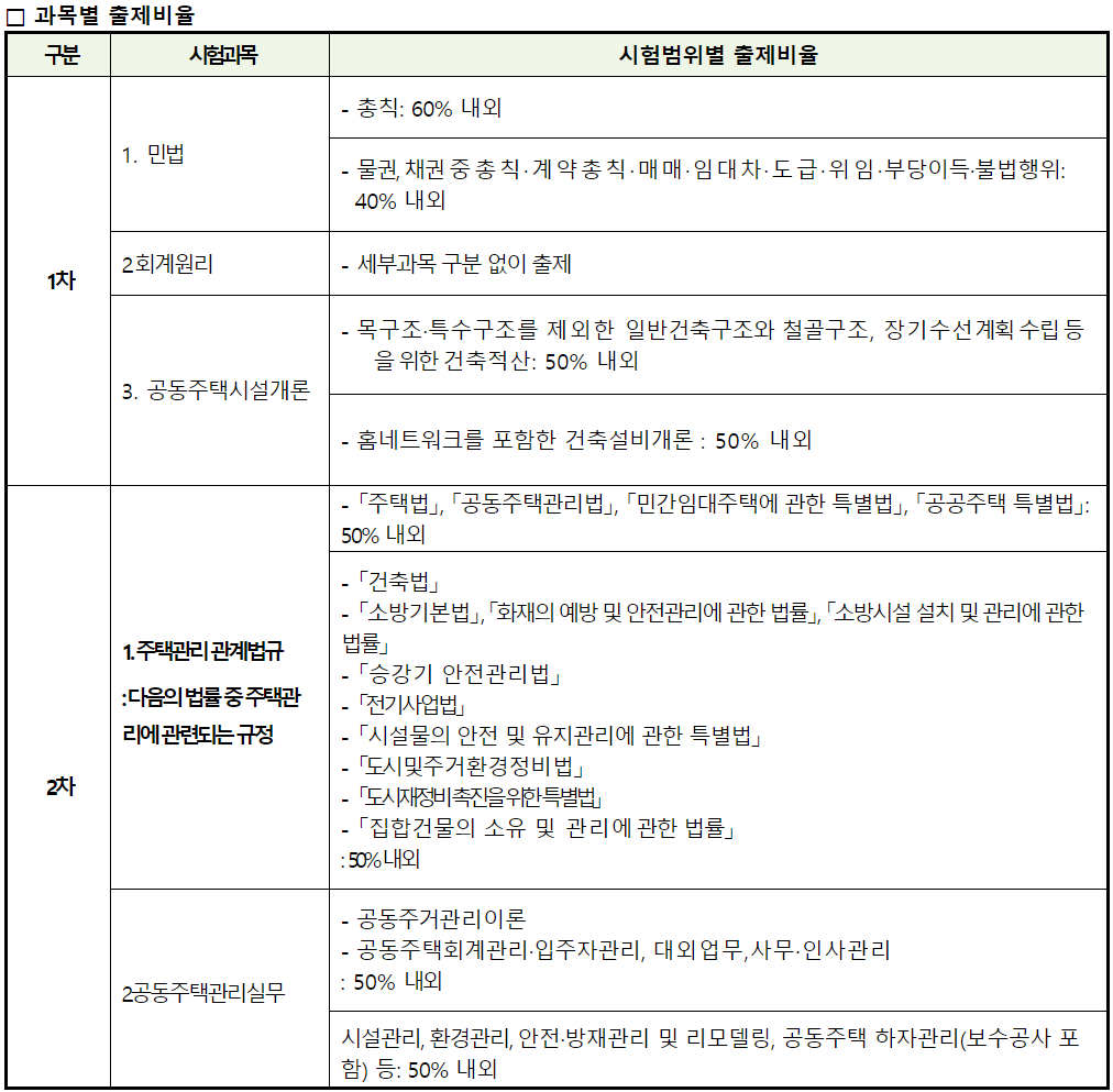 - 1교시 : 주택관리관계법규, 공동주택관리실무 2과목, 100분