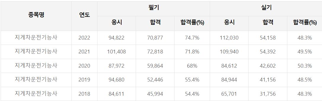 앞서 언급한 바와 같이 지게차운전기능사 필기와 실기는 취득하기 쉬운 시험입니다. 그렇기에 시험에 응시하는 사람들도 많고, 합격률도 높은 편입니다. 2018년부터 2022년까지의 합격률을 아래에서 확인해 보도록 하겠습니다.
