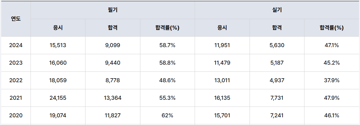 2024년 합격률을 알아보자면, 필기는 15,513명이 응시하여 9,099명이 합격했습니다.