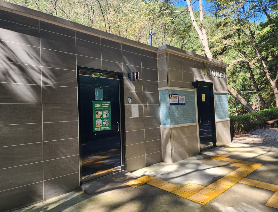 편의시설로는 깨끗한 화장실입니다. 수원지까지 오르는 길에 2개의 화장실이 있는데, 초입쯤에 하나가 설치되어 있고, 수원지에 오르는 입구에 하나가 설치되어 있습니다.