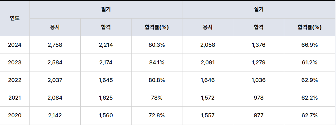 필기와 실기 모두 많은 합격률이 높기에 시험을 준비한다면 한 번에 합격할 수 있도록 노력해야 할 것 같습니다.
