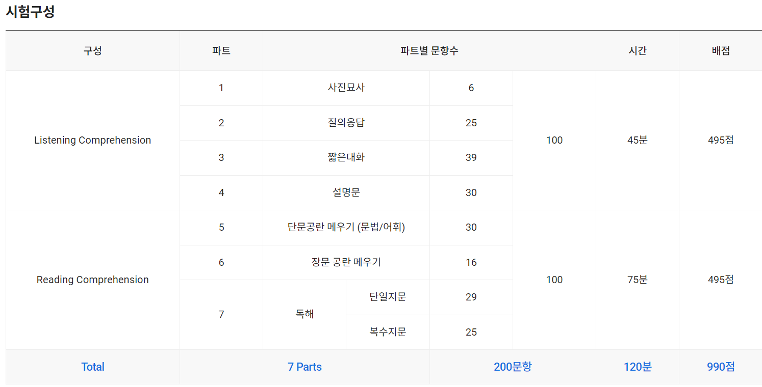 따라서 토익시험은 7개의 파트로 나뉘며 각각 100문항씩 전채 200문항이며, 120분의 시험시간이 주어지고, 990점 만점이 됩니다.