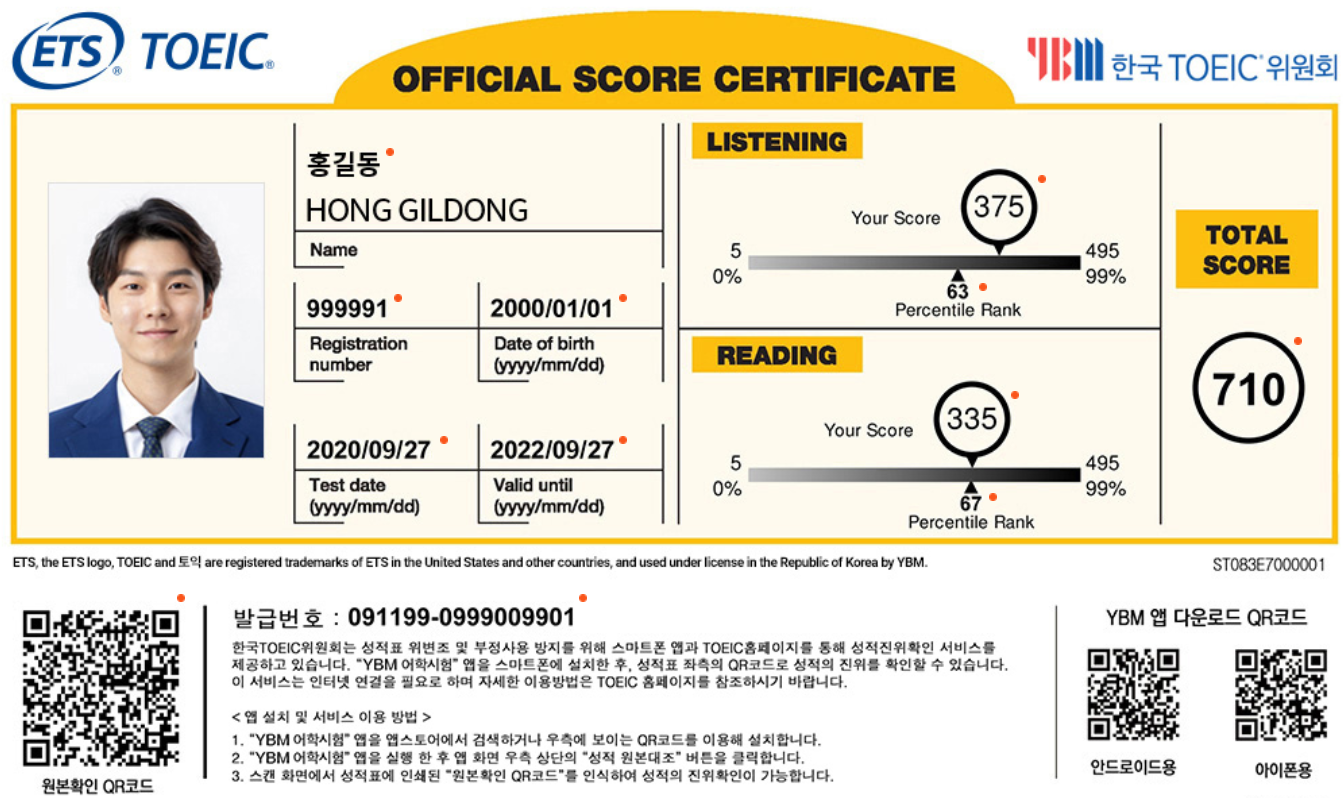 아래는 토익성적표 양식의 예시이니 참고하시면 됩니다.