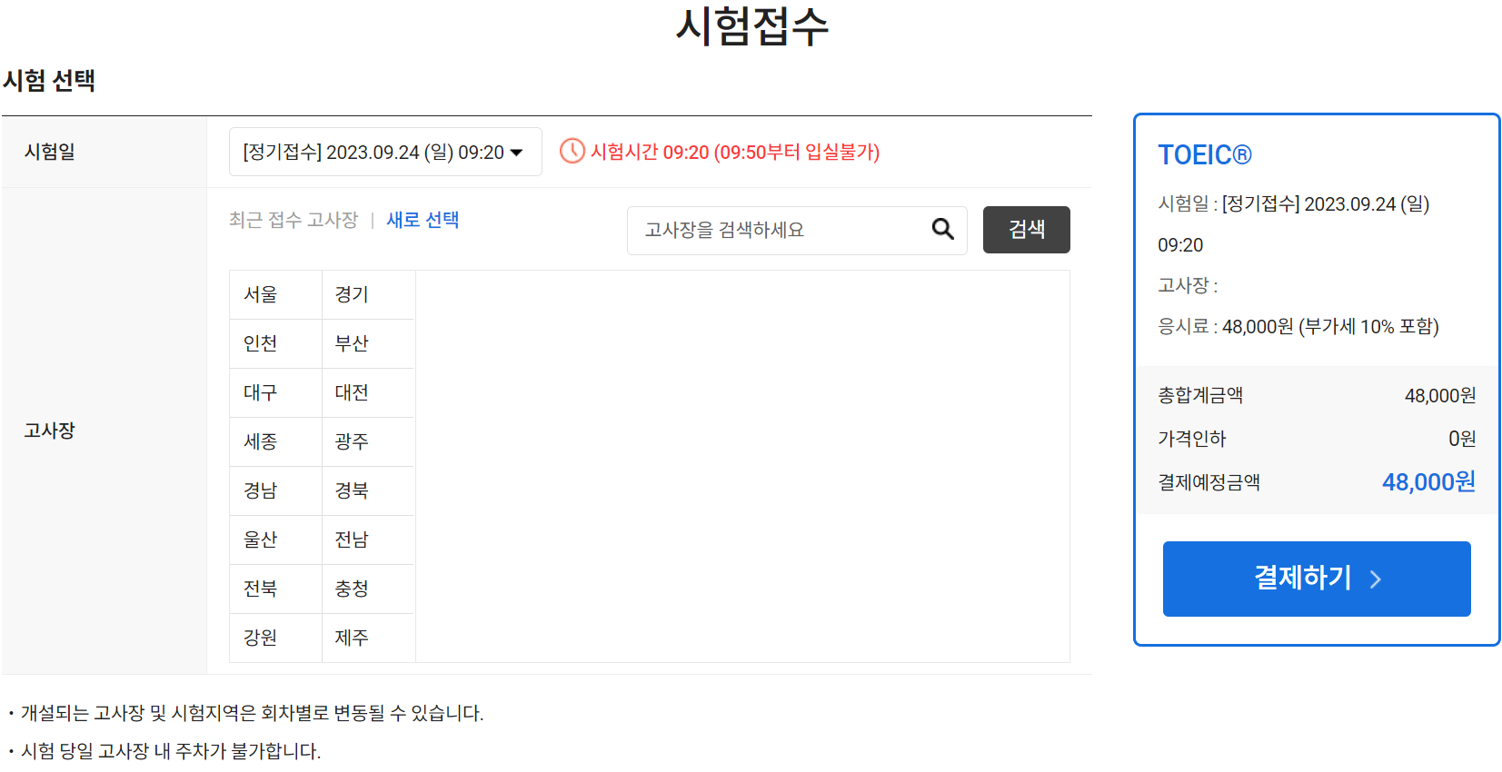 토익시험 응시료는 48,000원이며, 결제는 신용카드, 계좌이체, 휴대폰결제, 카카오페이, 토스, 네이버페이가 있습니다.